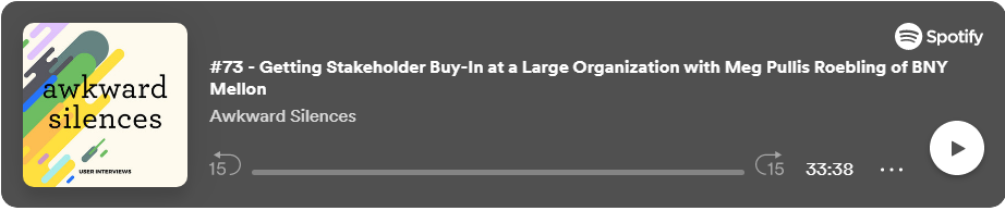 In awkward silences episode 73, hosts Erin H. May and John-Henry Forster spoke with Meg Pullis Roebling about getting stakeholder buy-in for User Research at large organizations. Spotify | Apple Podcasts.