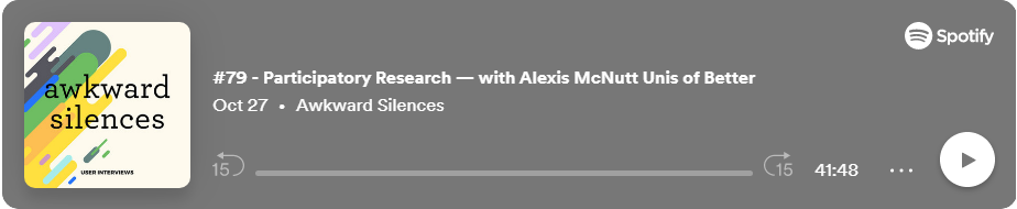 What is participatory research? And how do you include it in your UXR practice? Alexis explains how she involves stakeholders in engaging workshops, co-creates with participants, and takes research readouts to the next level to drive a participatory research practice that works for everyone. (Spotify 10/27)